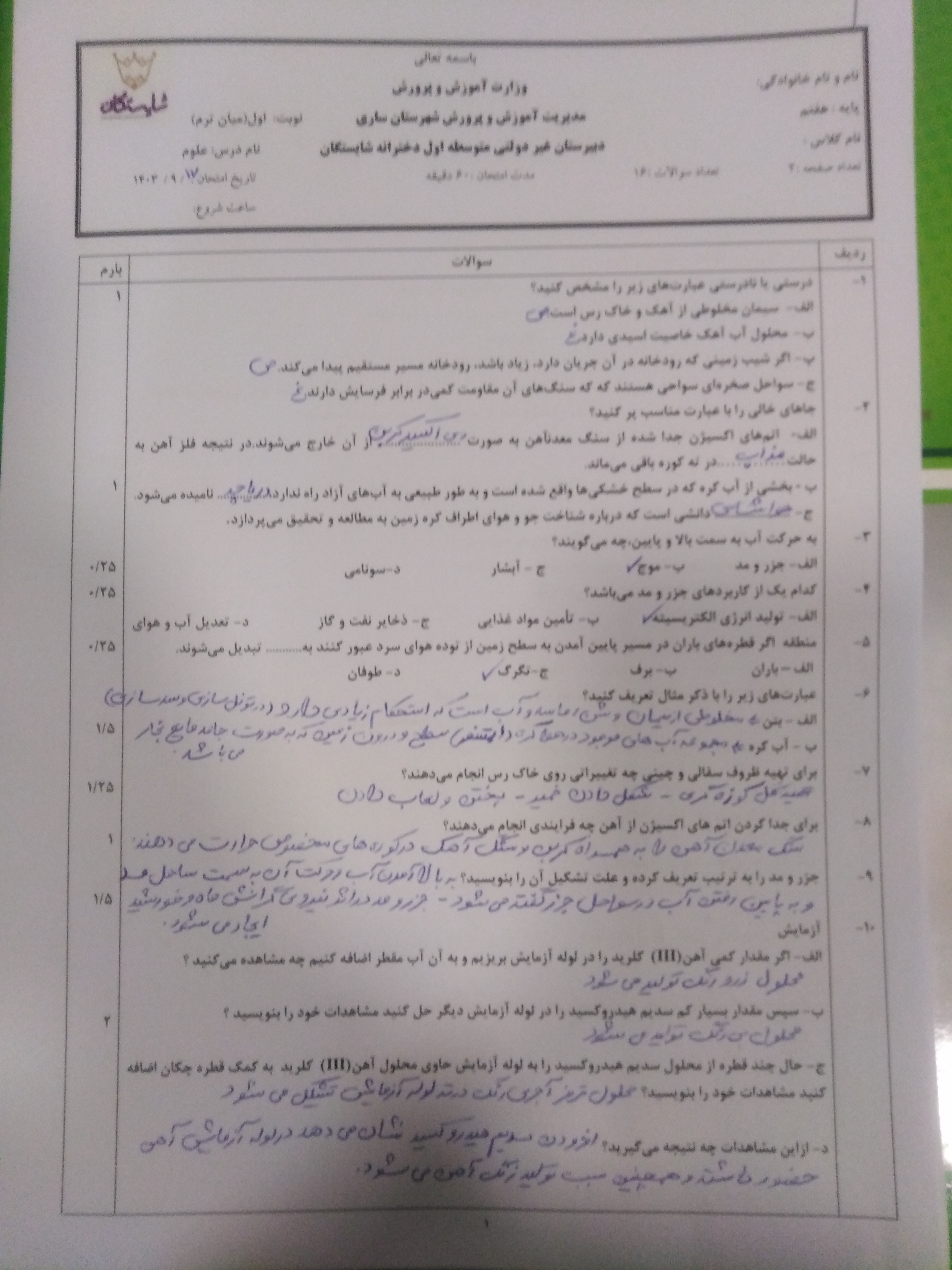 شیمی هفتم، فصل اول جزوه ونمونه سوالhttps://shayestegansari.ir//cache